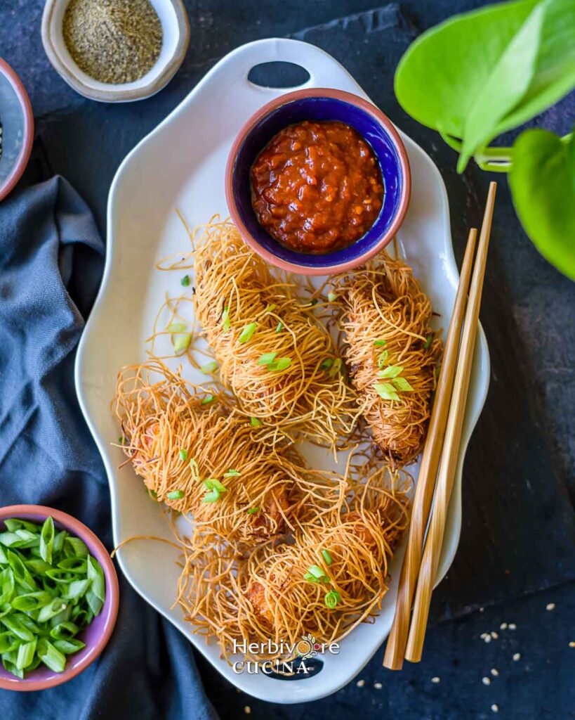 Crispy fried chicken tossed in a spicy and tangy sauce made with yogurt, curry leaves, and green chilies.